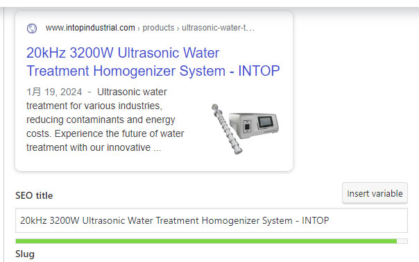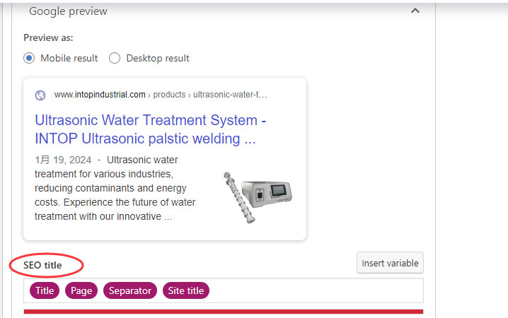 而有些客户的站点名过长,就会出现这样的标题,站点名那部分关键词跟这个页面要优化的关键词并不相关。这样会给搜索引擎照成混淆,搞不清楚这个页面到底是water treatment还是plastic welding!正确的是,站点名要短一点,本例的情况,站点名只要有品牌名INTOP就可以了。